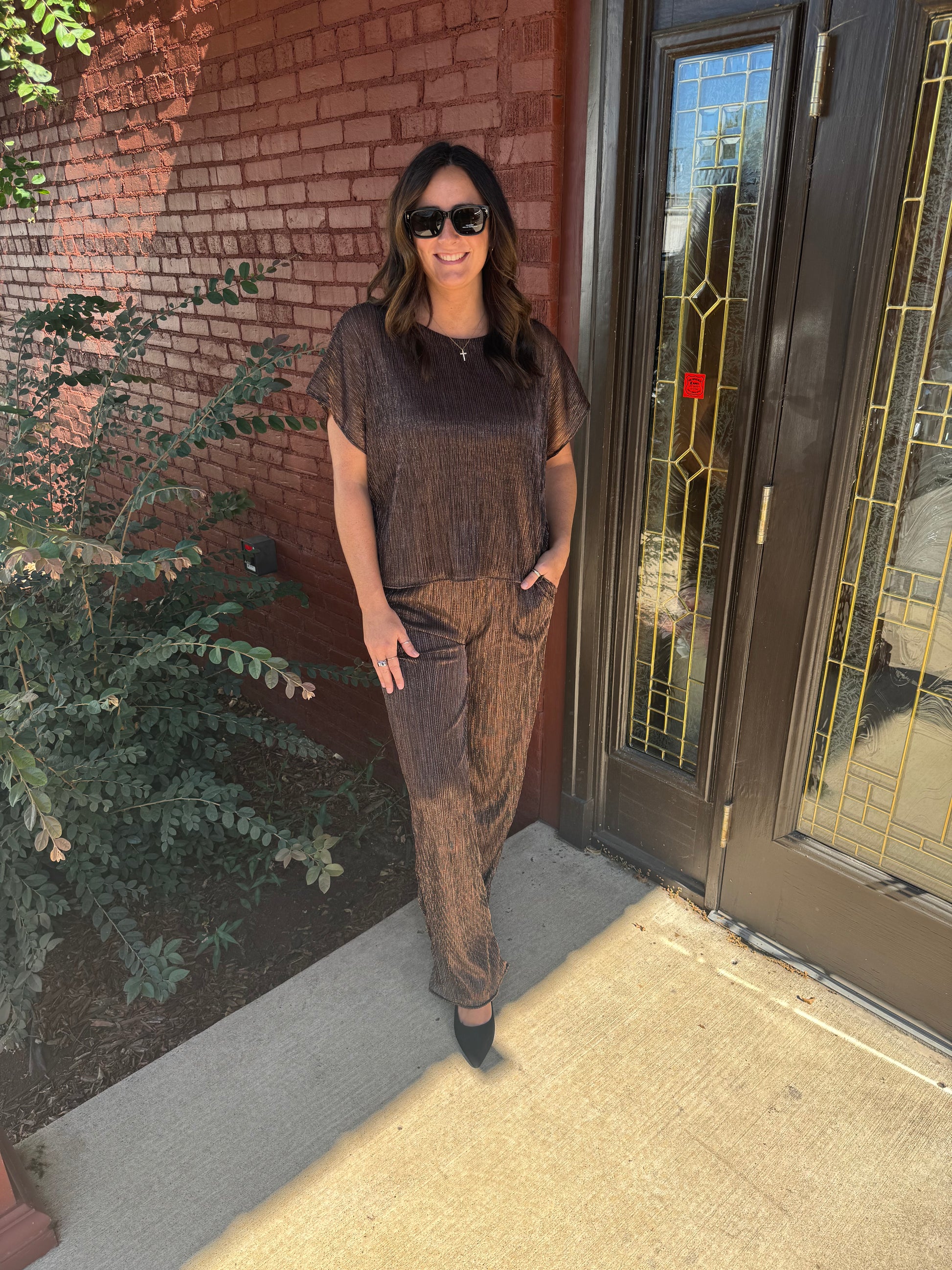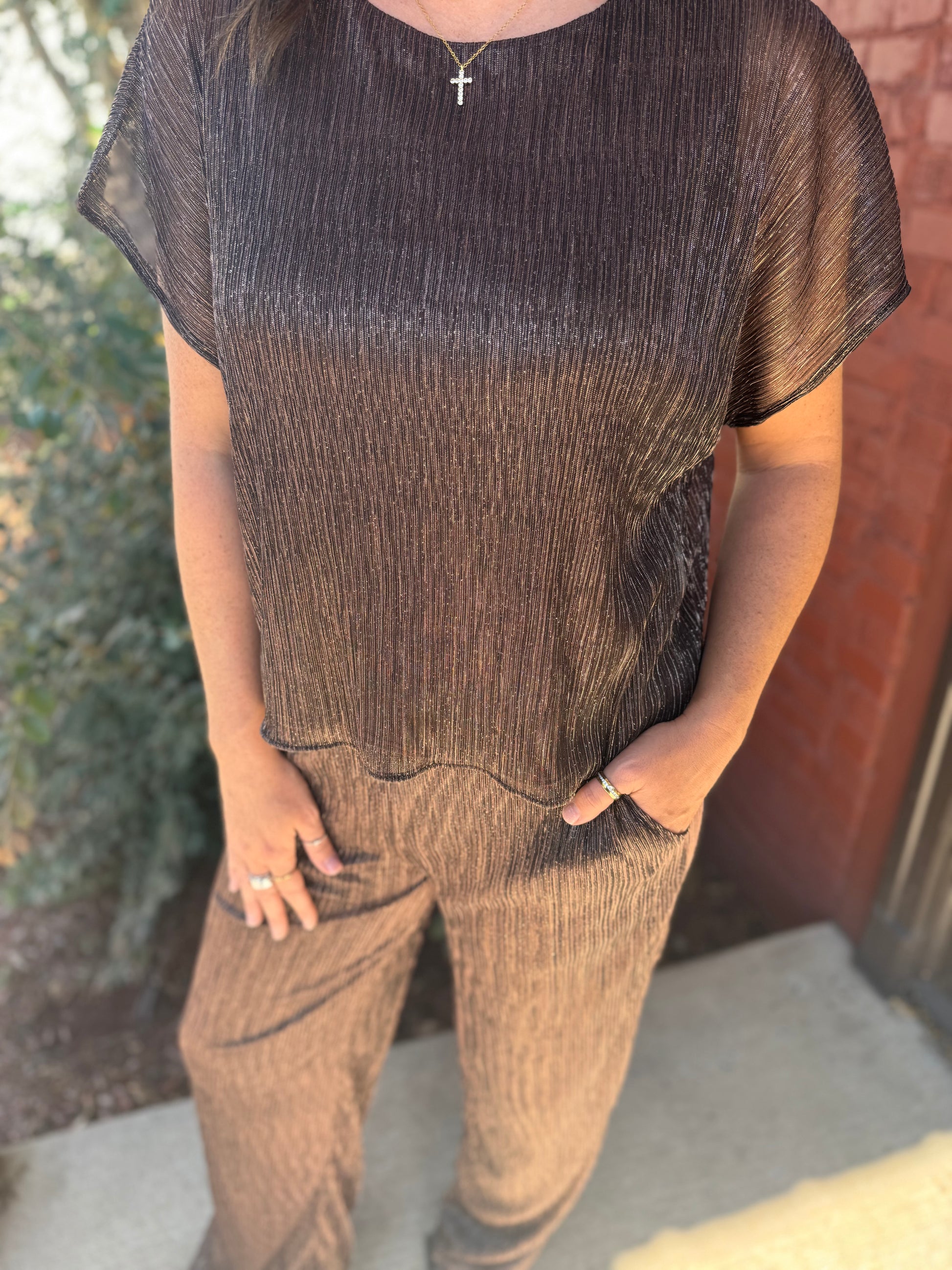 Short Sleeve boat neck metallic top with matching pants with pockets.